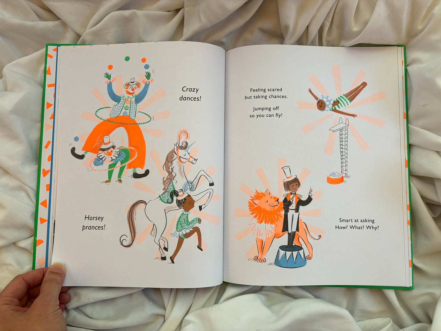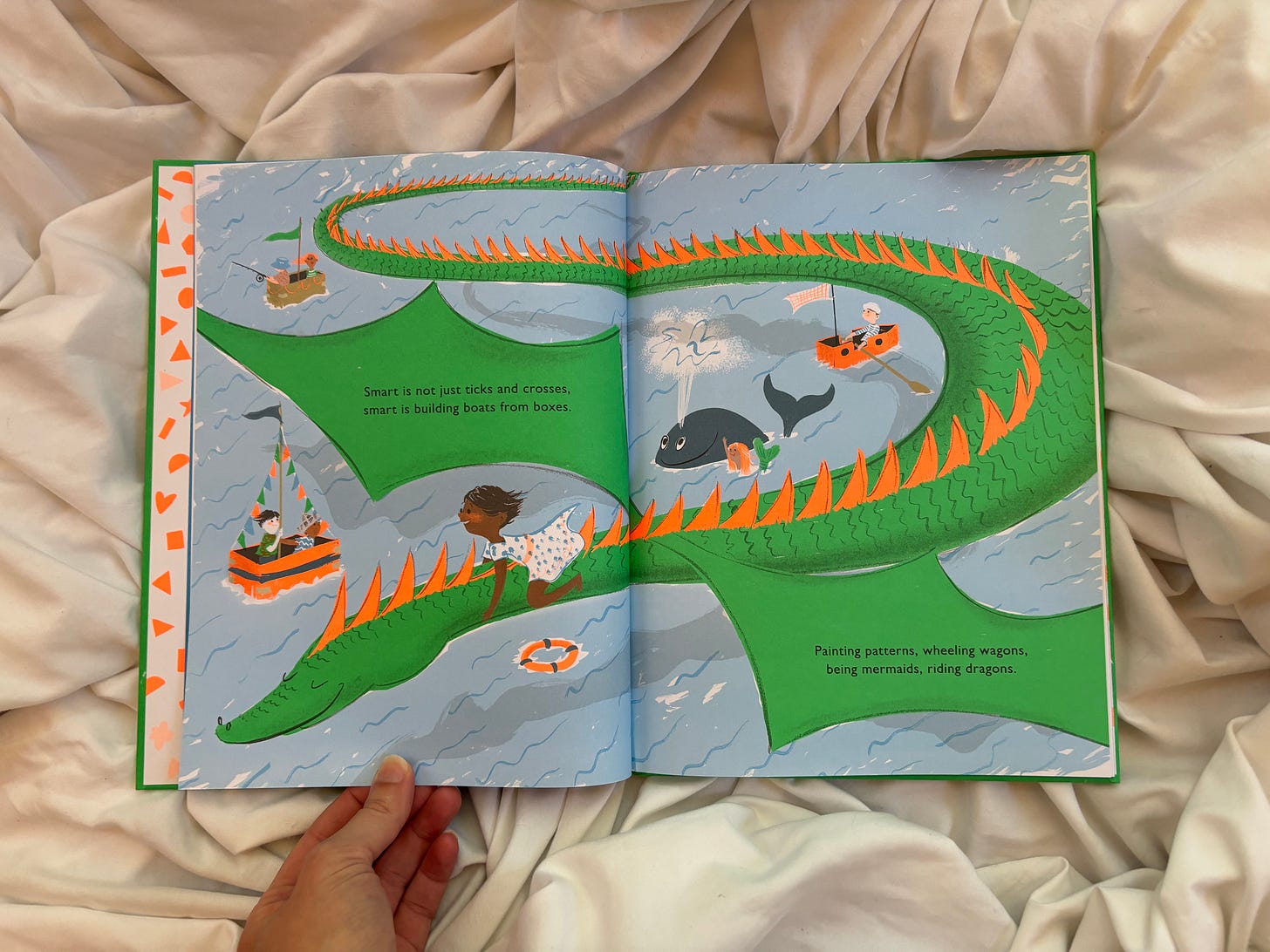 The book lists almost every way a child could spend time: drawing stars, prancing like a horse, blowing bubbles. It calls every one of those activities smart. Here’s some examples: