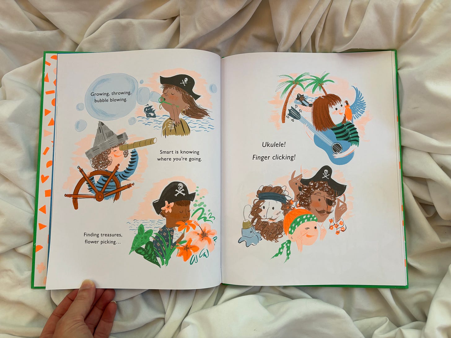 “Growing, throwing, bubble blowing. Smart is knowing where you’re going. Finding treasures, flower picking. Ukulele! Finger clicking!”