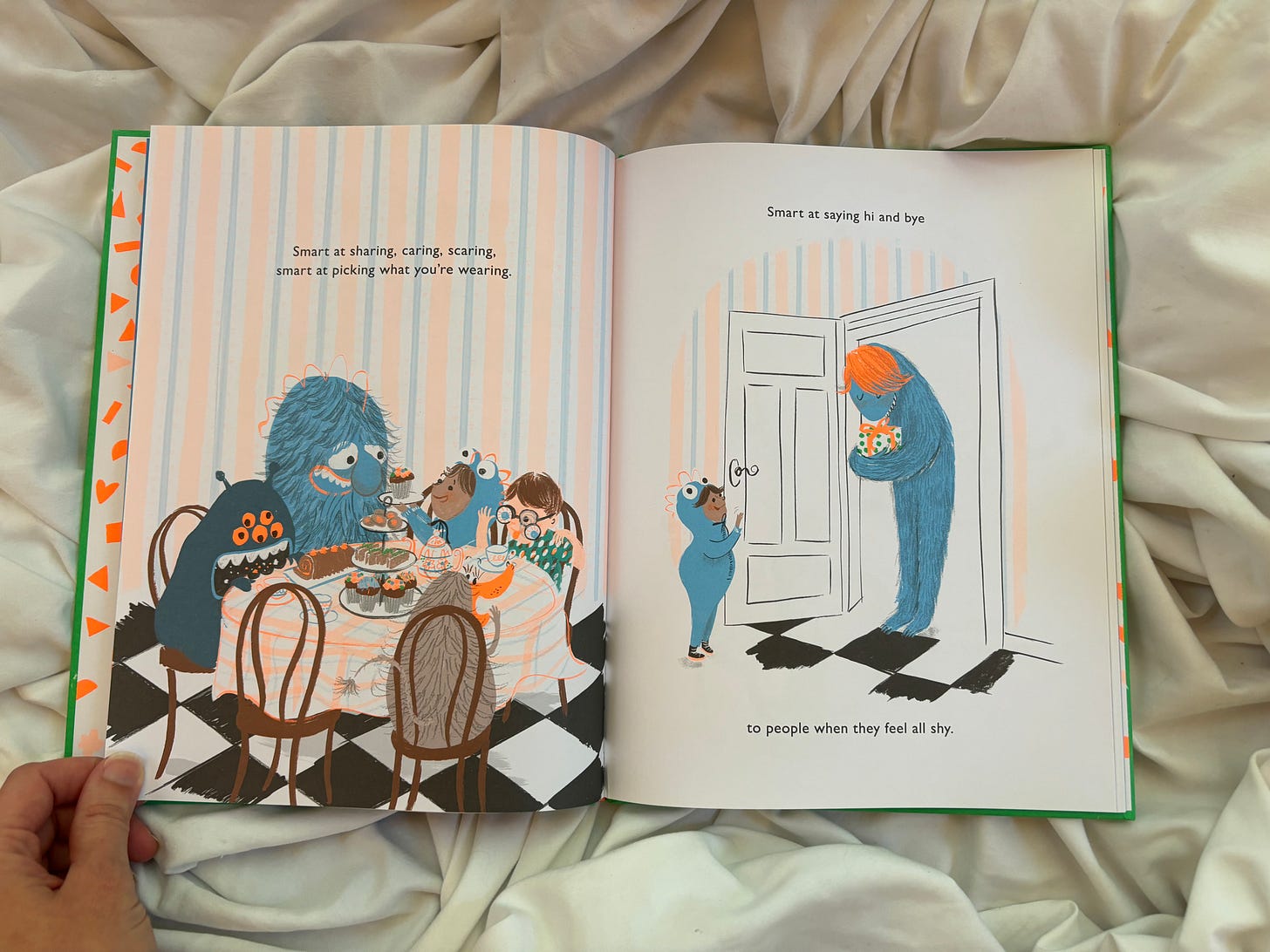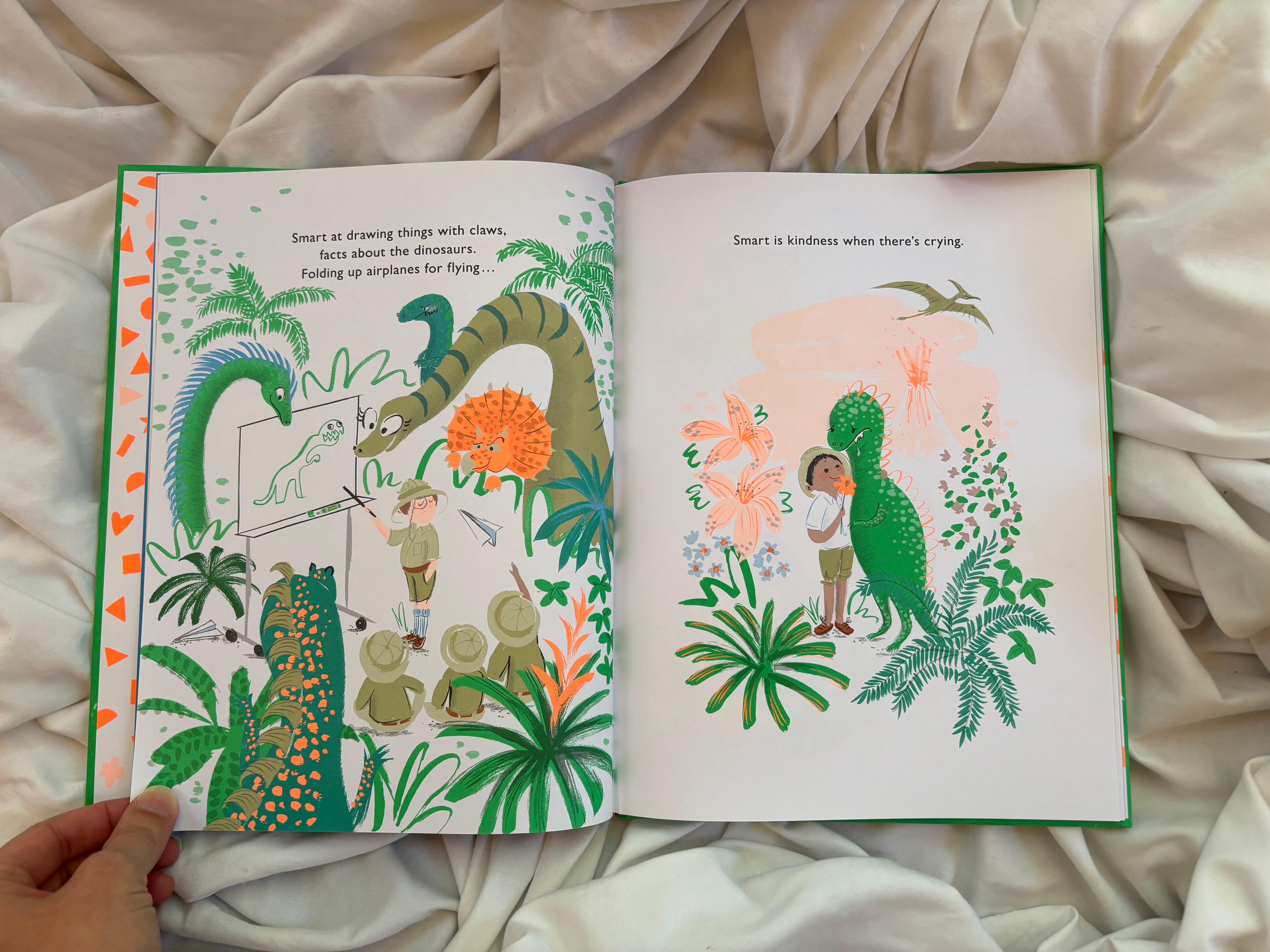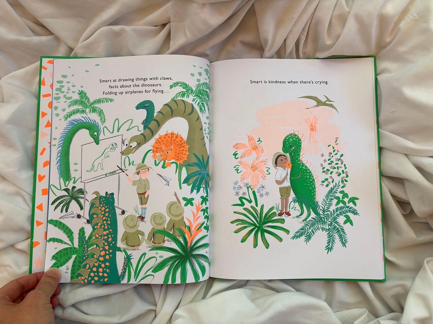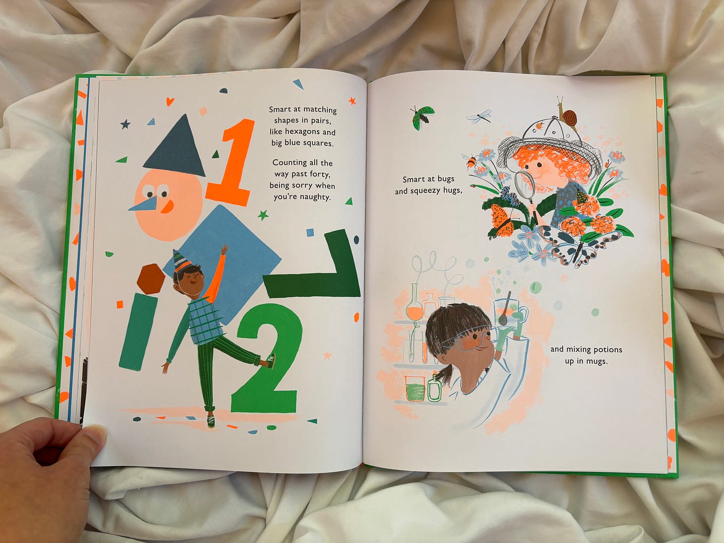 One option is to jump into the meaninglessness of the word “smart,” which is what this book does with aplomb. Per the book, “smart is not just being best / at spelling bees, a tricky test.” You can be “smart at sharing, caring, scaring, / smart at picking what you’re wearing.” And on and on!